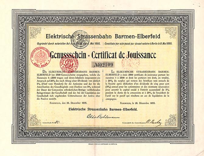 | Keywords: Elektrische Straßenbahn Barmen-Elberfeld 1985.jpg de Genussschein der Elektrischen Straßenbahn Barmen-Elberfeld vom 28 Dezember 1895 1895-12-28 http //www gutowski de/Katalog-57/Katalogbilder/238 jpg Unbekannte Autoren und Grafiker; Scan von Auktionshaus Vladimir Gutowski other versions PD-old-70-1923 Genussschein Wuppertaler Stadtwerke Trams in Wuppertal 1895 Stock certificates from Germany Stock certificates from Germany Elektrischen Straßenbahn Barmen-Elberfeld | ||||