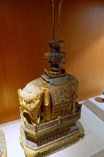 Keywords: Elephant candlesticks, 2 of 2, Tibet, 1644-1911 AD, gilt copper - Sichuan Provincial Museum - Chengdu, China - DSC04455.jpg en Exhibit in the Sichuan Provincial Museum 四 博物院 also known as the Sichuan Museum 251 Huanhua S Road Chengdu Sichuan China Photography was permitted in the museum without restriction This work is old enough so that it is in the public domain 2015-09-24 02 29 09 own Daderot other versions PD-old-100 cc-zero Metalwork of Tibet in the Sichuan Provincial Museum |