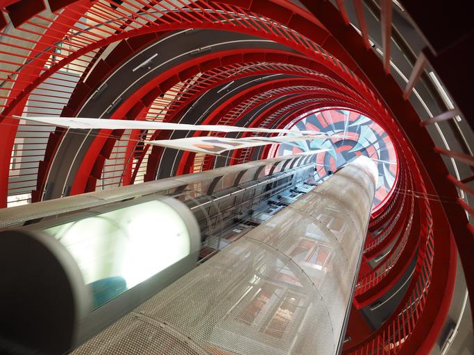 Keywords: elevator lift staircase futuristic architecture locomotion drive rise descent red building interior art
