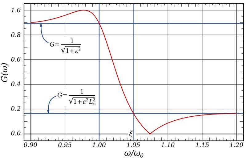 | Keywords: Elliptic Filter Response (4th Order, Detail).svg elliptic filter detail of the transistion band Also shown is the maximum extent of the passband ripples where is the ripple factor and L<sub>n</sub> is the discrimination factor own Inductiveload 2009-01-29 Mathematica Code <pre><nowiki> xp2zeta_ Module g num den g Sqrt4 zeta 2 + 4 zeta 2 zeta 2 - 1 2/3 ; num 2 zeta 2 Sqrtg; den Sqrt8 zeta 2 zeta 2 + 1 + 12 g zeta 2 - g 3 - Sqrtg 3; num/den ; xz2zeta_ zeta 2/xp2zeta; tzeta_ Sqrt1 - 1/zeta 2; r1zeta_ x_ x; r2zeta_ x_ tzeta + 1 x 2 - 1 / tzeta - 1 x 2 + 1 ; r3zeta_ x_ x 1 - xp2zeta x 2 - xz2zeta / 1 - xz2zeta x 2 - xp2zeta ; r4zeta_ x_ Module num den num 1 + tzeta 1 + Sqrttzeta 2 x 4 - 2 1 + tzeta 1 + Sqrttzeta x 2 + 1; den 1 + tzeta 1 - Sqrttzeta 2 x 4 - 2 1 + tzeta 1 - Sqrttzeta x 2 + 1; num/den ; ellgainxi_ w_ w0_ ep_ 1/Sqrt1 + ep 2 r4xi w/w0 2; Plot ellgain1 05 w 1 0 5 w 0 3 </nowiki></pre> Elliptic filters |