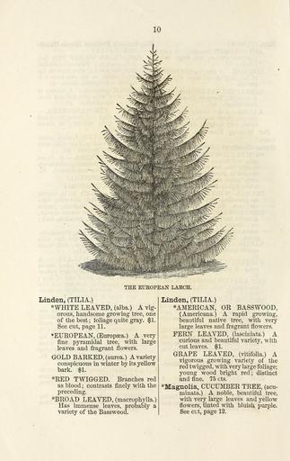 | Keywords: Ellwanger and Barry's descriptive catalogue of ornamental trees and shrubs, roses, flowering plants, etc., etc., etc (16250056220).jpg 10 <br> THE EUROPEAN LARCH <br> Linden TILIA <br> WHITE LEAVED alba A vig- <br> orous handsome growing tree one <br> of the best ; foliage quite gray 1 <br> See cut page 11 <br> ˘EUROPEAN Europsea A very <br> fine pyramidal tree with large <br> leaves and fragrant flowers <br> GOLD BARKED aurea A variety <br> conspicuous in winter by its yellow <br> bark 1 <br> RED TWIGGED Branches red <br> as blood ; contrasts finely with the <br> preceding <br> BROAD LEAVED macrophylla <br> Has immense leaves probably a <br> variety of the Basswood <br> Linden TILIA <br> ™¦AMERICAN OR BASSWOOD <br> Americana A rapid growing <br> beautiful native tree with very <br> large leaves and fragrant flowers <br> FERN LEAVED lasciniata A <br> curious and beautiful variety with <br> cut leaves 1 <br> GRAPE LEAVED vitifolia A <br> vigorous growing variety of the <br> red twigged with very large foliage; <br> young wood bright red; distinct <br> and fine 75 cts <br> ™¦Magnolia CUCUMBER TREE acu- <br> minata A noble beautiful tree <br> with very large leaves and yellow <br> flowers tinted with bluish purple <br> See cut page 12 42747597 136502 68419 Page 10 Text http //www biodiversitylibrary org/page/42747597 1868 10 1080/00222930308678875 Ellwanger Barry ; Henry G Gilbert Nursery and Seed Trade Catalog Collection ; Mount Hope Nurseries NameFound Magnolia NameConfirmed Magnolia sect Splendentes Dandy ex J A Vazquez G EOLID 44478 Biodiversity Heritage Library Ellwanger Barry's descriptive catalogue of ornamental trees and shrubs roses flowering plants etc etc etc Garden Stories Catalogs Ellwanger Barry Nurseries Horticulture Nursery stock Ornamental trees Plants Shrubs U S Department of Agriculture National Agricultural Library bhl page 42747597 dc identifier http //biodiversitylibrary org/page/42747597 European larch bhlGardenStories BHLinbloom ellwanger barry nurseries horticulture u s department of agriculture national agricultural library bhlgardenstories bhlinbloom Information field Flickr posted date ISOdate 2015-02-03 CC-BY-2 0 BioDivLibrary https //flickr com/photos/61021753 N02/16250056220 2015-08-25 01 54 06 cc-by-2 0 PD-old-70-1923 Ellwanger Barry's descriptive catalogue of ornamental trees and shrubs roses flowering plants etc etc etc Photos uploaded from Flickr by Fæ using a script |