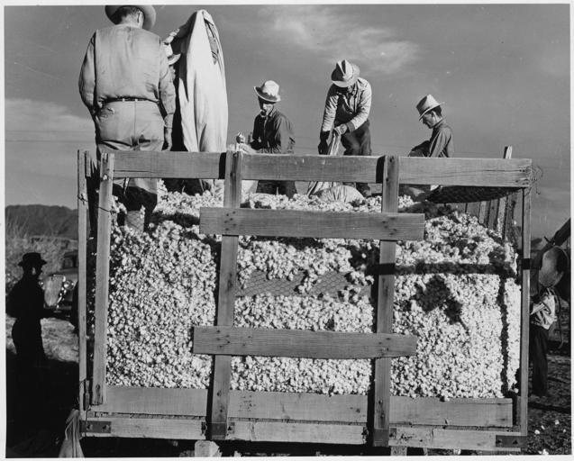 | Keywords: Eloy District, Pinal County, Arizona. Migrant cotton pickers dumping their sacks into the field wago . . . - NARA - 522519.jpg Scope and content Full caption reads as follows Eloy District Pinal County Arizona Migrant cotton pickers dumping their sacks into the field wagon at end of day Man with back toward observer is the the field foreman a company employee General notes 522519 Local identifier 83-G-44350 Department of Agriculture Bureau of Agricultural Economics Division of Economic Information ca 1922 - ca 1953 NARA-Author Lange Dorothea 1895-1965 Photographer 1372774 <br /> Still Picture Records Section Special Media Archives Services Division NWCS-S National Archives at College Park 8601 Adelphi Road College Park MD 20740-6001 11/1940 Record group Record Group 83 Records of the Bureau of Agricultural Economics 1876 - 1959 Record group ARC 412 Photographic Prints Documenting Programs and Activities of the Bureau of Agricultural Economics and Predecessor Agencies compiled ca 1922 - ca 1947 documenting the period ca 1911 - ca 1947 Series ARC 521048 File unit File unit ARC Variant control numbers NAIL Control Number NWDNS-83-G-44350 Other versions <gallery> File Eloy_District _Pinal_County _Arizona _Migrant_cotton_pickers_dumping_their_sacks_into_the_field_wago_ _ _ _-_NARA_-_522519 tif tif File Eloy_District _Pinal_County _Arizona _Migrant_cotton_pickers_dumping_their_sacks_into_the_field_wago_ _ _ _-_NARA_-_522519 jpg jpg </gallery> NARA-cooperation PD-USGov Dorothea Lange Eloy Arizona 1940 in Arizona November 1940 in the United States Cotton sacks Wagons in the United States Agricultural transport Agricultural workers Men at work in the United States Wages in the United States Migrant workers |