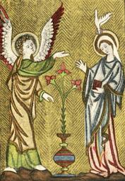 | Keywords: Embroidered bookbinding 13th century Annunciation.jpg  Embroidered bookbinding The earliest example of an embroidered book in existence is I believe the manuscript English Psalter written in the thirteenth century which afterwards belonged to Anne daughter of Sir Simon de Felbrigge K G standard-bearer to Richard ii Anne de Felbrigge was a nun in the convent of Minoresses at Bruisyard in Suffolk during the latter half of the fourteenth century and it is quite likely that she herself worked the cover ”such work having probably been largely done in monasteries and convents during the middle ages On the upper side is a very charming design of the Annunciation and on the under another of the Crucifixion each measuring 7¾ by 5¾ inches In both cases the ground is worked with fine gold threads 'couched' in a zigzag pattern the rest of the work being very finely executed in split-stitch by the use of which apparently continuous lines can be made each successive stitch beginning a little within that immediately preceding it ”the effect in some places being that of a very fine chain-stitch The lines of this work do not in any way follow the meshes of the linen or canvas as is mostly the case with book-work upon such material but they curve freely according to the lines and folds of the design English Embroidered Bookbindings by Cyril James Humphries Davenport F S A edited by Alfred Pollard London 1899 gutenberg English Embroidered Bookbindings 17585 Image published 1899 Embroidery is a Victorian restoration of 16th century original author PD-old Embroidered book covers Medieval art Miniatures of annunciation 13th-century art People with Doves in Christian art People with flowers in art Embroidery of England Close-ups of woven textiles Opus Anglicanum |