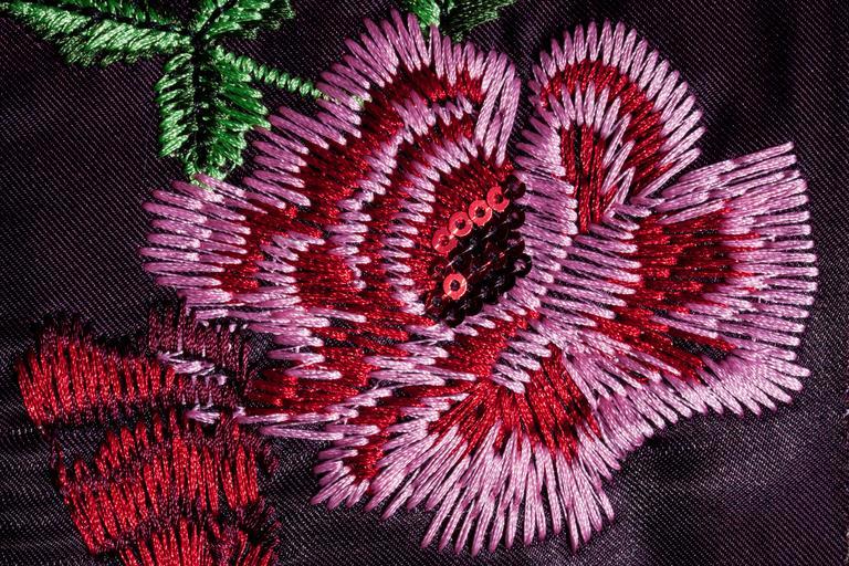 Keywords: embroidery textiles fabric pull through sewing threads ornate blossom bloom leaf pink red needle painting