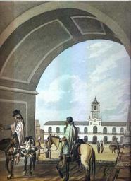 Keywords: Emeric Essex Vidal - Vista del Cabildo desde la Recova - 1817.jpg Emeric Essex Vidal 1791-1861 The Plaza or Big Square of Buenos Aires View of the Cabildo from the Recova Buenos Aires Argentina Acuarela de Emeric Essex Vidal 1791-1861 La Plaza o Gran Square de Buenos Aires Vista del Cabidlo desde la Recova Buenos Aires Argentina Picturesque Ilustrations of Buenos Aires Viau Buenos Aires 1943 Emeric Essex Vidal 1791-1861 1817 Información adicional Al publicar sus acuarelas en 1820 Emeric Vidal incluyó el siguiente comentario referido a esta acuarela Esta vista de la Plaza o gran Square de Buenos Aires está tomada desde debajo del arco central de la Recova descripta en el artículo precedente que forma el lado Este de la misma Al norte pueden verse algunas casas particulares y parte de la catedral El Cabildo o Ayuntamiento ocupa el lado Oeste y tiene también una plaza Al Sud existe una fila de casas de comercio bajas y míseras con un ancho pavimento frente a ellas sobre el cual los revendedores colocan sus puestos llenos de toda clase de objetos europeos de quincalla Se había pensado continuar la Recova por este lado para formar un paseo cubierto por tres lados de la Plaza pero el proyecto no se ha realizado por falta de medios El Cabildo se usa principalmente como cárcel pero en el piso alto existen algunos salones donde a veces se reúnen las autoridades municipales que arengan desde el balcón a los ciudadanos en los días de grandes solemnidades exhibiendo estandartes y otros trofeos arrebatados a sus enemigos A un extremo de este edificio existe un cuarto de guardia y después de la puesta del sol a toda persona que pasa le es dado el alto por el centinela En el centro de la Plaza hay un pequeño obelisco erigido para conmemorar la declaración de la independencia de Buenos Aires y provincias unidas al cual se le conoce como el Altar de la Libertad Vidal Emeric Essex; Ilustraciones pintorescas de Buenos Aires y Montevideo Consistentes en venticuatro vistas acompañadas de descripciones del paisaje Londres 1820 PD-old Plaza de Mayo Buenos Aires Paintings from Argentina Emeric Essex Vidal History of Buenos Aires |
