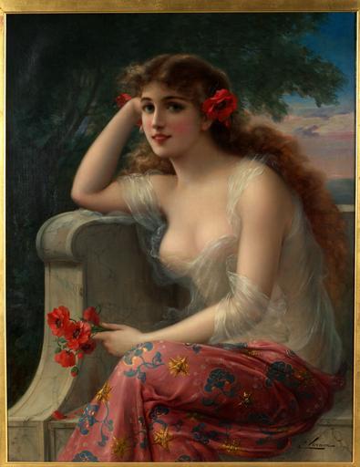 Keywords: Emile Vernon-Girl with a Poppy.jpg Girl with a Poppy Creator Émile Vernon Oil Canvas cm 91 71 www uppsalaauktion se Public domain Other versions PD-Art Papaver in art Portrait paintings of sitting women Females looking at viewer in art Thinking in art Portrait paintings of females with flowers Transparent clothing in art Paintings not categorised by year Émile Vernon Women facing left in art Sitting with head resting on hand