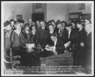 | Keywords: Emmett D. Boyle of Nevada 160070v.jpg Governor Emmett D Boyle of Nevada signing resolution for ratification of Nineteenth Amendment to Constitution of U S - Mrs Sadie D Hurst who presented the resolution Speaker of the Assembly D J Fitzgerald and group of Suffrage Women Feb 7 1920 Carson City Nevada 1920 Feb 7 Photograph of group of suffragists watching the governor of Nevada sign resolution for ratification in his office 1 photograph print 8 x 10 in accession number Call Number Location National Woman's Party Records Group I Container I 160 Folder Ratification Campaign 1919-20 Source Collection Records of the National Woman's Party institution Library of Congress LOC-image mnwp 160070 PD-old suffragettes Suffragettes wearing fur Beaver clothing Fur fashion in 1920 1920 in Nevada Carson City Nevada |