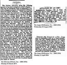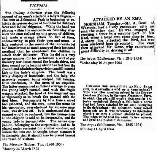 Keywords: Emu attacks 1864 1873 1904.jpg en from the http //www nla gov au/ndp/ National Library Australian newspapers digitisation program which are pre-1955 so no copyright The service includes newspapers published in each state and territory from the 1800s to the mid-1950s when copyright applies http //nla gov au/nla news-article10334173 http //nla gov au/nla news-article8920003 http //nla gov au/nla news-article5747338 The Argus The Mercury 1864 1873 1904 PD-Australia Emus in art National Library of Australia - Australian Newspapers Service |