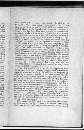 | Keywords: Encouragements and Warnings p07.JPG en Speech of National Civil Service Reform League president Carl Schurz before its annual meeting of December 10 1896 in Philadelphia p 7 Single page scan 200 dpi Carl Schurz Encouragements and Warnings National Civil Service Reform League 1896; courtesy of Boston Public Library Carl Schurz 1896-12-10 PD-Old Encouragements and Warnings Page Images | ||||