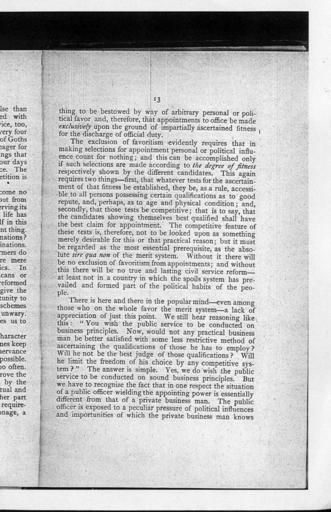 | Keywords: Encouragements and Warnings p13.JPG en Speech of National Civil Service Reform League president Carl Schurz before its annual meeting of December 10 1896 in Philadelphia p 13 Single page scan 200 dpi Carl Schurz Encouragements and Warnings National Civil Service Reform League 1896; courtesy of Boston Public Library Carl Schurz 1896-12-10 PD-Old Encouragements and Warnings Page Images | ||||