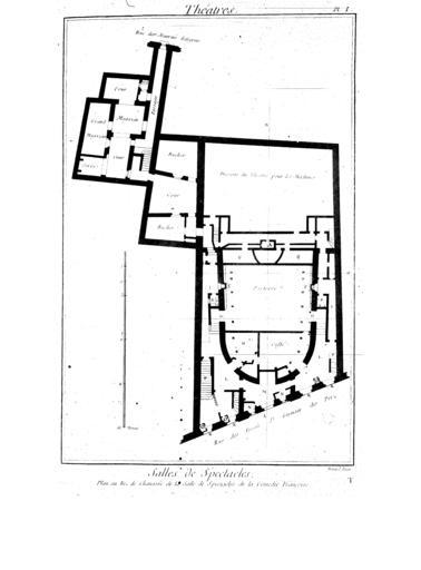 | Keywords: Encyclopedie volume 9-048.png Comédie-Française on the rue des Fossés Saint-Germain-des-Prés from Diderot's Encyclopedia plates livraison 9 bpt6k50564m/f49 image Author info François d'Orbay architect Author info Robert Bénard engraver after 1772 <gallery> File Diderot's Encyclopédie Vol10 1752 Theatres Comédie Française plate1 - plan of the ground floor - Dover reprint 1995 jpg Dover reprint </gallery> Book Encyclopedie Planches 9 047 049 PD-old-100-1923 Encyclopédie ou Dictionnaire raisonné des sciences des arts et des métiers volume 9 048 Hôtel des Comédiens ordinaires du roi Engravings by Robert Bénard |
