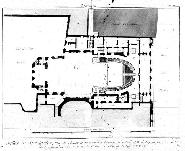 | Keywords: Encyclopedie volume 9-056.png Floor plan at the level of the first loges of the Théâtre de l'Opéra on the rue Saint-Honoré Palais-Royal Paris also known as Moreau's opera house Diderot's Encyclopédie vol 10 Théâtres Salle de l'Opéra plate 2 1770 inauguration of the theatre http //gallica bnf fr/ark /12148/bpt6k50564m/f57 image r langEN Gallica architect Creator Pierre-Louis Moreau-Desproux engraver Robert Bénard Book Encyclopedie Planches 9 055 057 PD-old-100-1923 Encyclopédie ou Dictionnaire raisonné des sciences des arts et des métiers volume 9 056 Seconde salle du Palais-Royal Engravings by Robert Bénard |