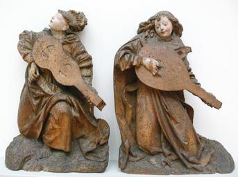 Keywords: Engel mit Viola und Laute Oberrhein um 1490.jpg de Engel mit Viola und Laute Oberrhein um 1490; Lindenholz Reste alter Fassung Engel mit Laute nach einem Kupferstich von Martin Schongauers Kupferstich mit dem Bischofsstab en Angels playing viola and lute Upper Rhine area c 1490; limewood remains of old paint the angel playing the lute is inspired by a copperplate print of Martin Schongauer <br />Skulpturensammlung Inv 7047/7048; erworben 1913 Bode-Museum Berlin own 2007 Photo Andreas Praefcke Object PD-old Photograph Gothic sculpture in the Bode-Museum Statues of angels in Berlin 1490s statues in Berlin Statues of string instrumentalists Angels with lute Rabel instrument Vielle Unidentified string instruments |