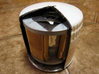 | Keywords: Engine oil filter cutaway.JPG en Motor oil filter cutaway image Bosch P3029 - one quarter is cutted away from filter casing Oil enters the paper from the outside of paper and leaves from the centre of filter cartridge Some of the filter paper is also removed so the paper support frame is visible There are two rows of 4 mm diameter oil flow holes in the high end of the frame not visible At the top of filter cartridge is oil bypass-valve own Harrikkamies 2010-04-09 Automobile oil filters Cutaways |