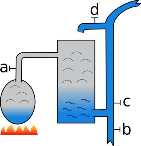 | Keywords: Engine savery.svg en Thomas Savery steam engine outline Valves a and c are both opened simultaneously Steam gets into the cylinder shoving water through c Valbes b and d are opened while a and c are closed Cold water is sprayed over the cylinder provoking the steam to condense which causes a vacuum which sucks out water from mine es Esquema de una máquina de vapor de Thomas Savery Las válvulas a y c se abren a la vez El vapor entra en el cilindro y empuja el agua a través de c Se abren las válvulas b y d se cierran a y c Sobre el cilindro se rocía agua fría que condensa el vapor creando un vacío que succiona el agua de la mina Savery-Dampfpumpe<br /> a Steuerhahn<br /> b Rückschlagventil<br /> c Rückschlagventil<br /> 2014-07-04 10 36 19 own MdeVicente cc-zero Uploaded with UploadWizard Drawings of steam engines Savery steam pumps |