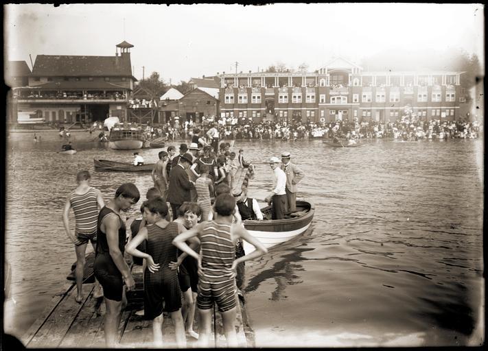 Keywords: monochrome photo border English Bay swimming race Date: 190- VPL 5454 Philip Timms photograph Content: People on the beach and in boats. First Beach Pavilion (taller building, left), the Crescent (lower building, left) and another bathhouse (built in 1905), right with Simpson's rental boat house in between. Boys and men line a platform in the water, foreground. Topic: Boats and boating Swimming More information on our historical photograph collection: www.vpl.ca/historicalphotos English Bay swimming race Date: 190- VPL 5454 Philip Timms photograph Content: People on the beach and in boats. First Beach Pavilion (taller building, left), the Crescent (lower building, left) and another bathhouse (built in 1905), right with Simpson's rental boat house in between. Boys and men line a platform in the water, foreground. Topic: Boats and boating Swimming More information on our historical photograph collection: www.vpl.ca/historicalphotos |