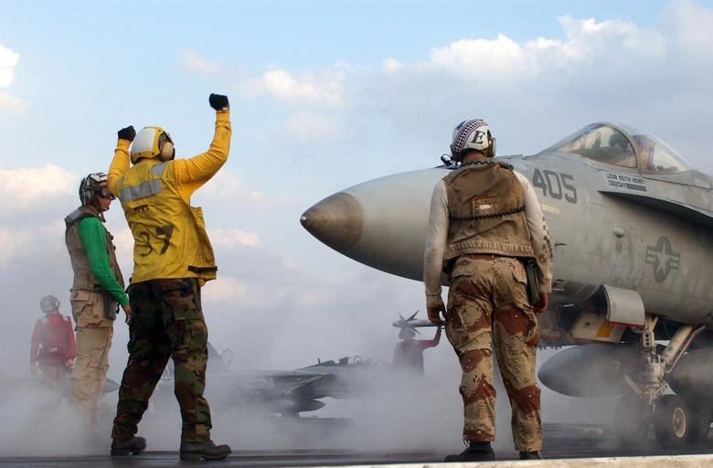 Keywords: US Navy 021103-N-1810F-014 Hornet moves into position over one of four steam driven catapults.jpg en At sea aboard USS Kitty Hawk CV 63 Nov 3 2002 -- Engulfed in steam an Aviation Boatswain s Mate from the air department s V-1 division brings an F/A-18C Hornet into position over one of four steam driven catapults for takeoff Kitty Hawk is the Navy s only permanently forward-deployed aircraft carrier and operates out of Yokosuka Japan U S Navy photo by Photographer s Mate 3rd Class Todd Frantom RELEASED 2002-11-03 021103-N-1810F-014 Navy http //www navy mil/view_image asp id 3208 U S Navy photo by Photographer s Mate 3rd Class Todd Frantom PD-USGov-Military-Navy Aboard USS Kitty Hawk CV-63 Pictures by Mass Communication Specialist Todd Frantom Photographs taken on 2002-11-03 Desert Battle Dress Uniform Desert Camouflage Uniform in 2002 Battle Dress Uniform in 2002 Military people in 2002 Taken with Nikon D1H Sailors at sea