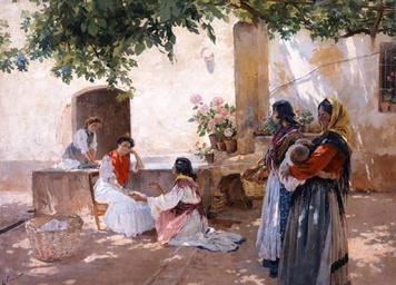| Keywords: Enrique Simonet - La buenaventura - 1899.jpg  Artwork Creator Enrique Simonet 1899 oil canvas cm 61 84 Institution Museo de Málaga LangSwitch Departamento de Pintura Abteilung für Malerei Departamento de Pintura Department of Paintings Departamento de Pintura Departamento de Pintura Département de la Peinture Departamento de Pintura Schilderijenafdeling object history credit line inscription E Simonet signature bottom left ~ accession number Source PD-old-auto 1927 Enrique Simonet 1899 paintings Paintings of courtyards and patios |