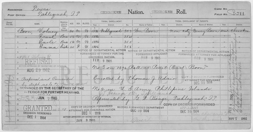 | Keywords: Enrollment for Cherokee Census Card R711 - NARA - 259774.tif Scope and content Name Earle Boon Type Rejected Age 16 Sex Male Degree Indian Blood 1/8 City of Residence Tahlequah Name Emma Boon Type Rejected Age 14 Sex Female Degree Indian Blood 1/8 City of Residence Tahlequah Name Frank Boon Type Rejected Age 18 Sex Male Degree Indian Blood 1/8 City of Residence Tahlequah Name Nancy Boon Type Parent Sex Female Name Volney Boon Type Rejected Age 20 Sex Male Degree Indian Blood 1/8 City of Residence Tahlequah Name William Boon Type Parent Sex Male General notes 259774 Local identifier 75-53A-CHEROKEE R711 Department of the Interior Office of Indian Affairs Office of the Commissioner to the Five Civilized Tribes 1893 - 1914 NARA's Southwest Region Fort Worth NRFA 1400 John Burgess Drive Fort Worth TX 76140 Record group Record Group 75 Records of the Bureau of Indian Affairs 1793 - 1999 Record group ARC 404 Enrollment Cards compiled 1898 - 1914 Series ARC 251747 File unit File unit ARC Variant control numbers NAIL Control Number NRFF-75-53A-2037<br /> NAIL Control Number NRFF-75-53A-2038<br /> NAIL Control Number NRFF-75-53A-2040<br /> NAIL Control Number NRFF-75-53A-2041<br /> NAIL Control Number NRFF-75-53A-2043<br /> NAIL Control Number NRFF-75-53A-2044<br /> NAIL Control Number NRFF-75-53A-CHEROKEE R711 yes Other versions <gallery> File Enrollment_for_Cherokee_Census_Card_R711_-_NARA_-_259774 tif tif File Enrollment_for_Cherokee_Census_Card_R711_-_NARA_-_259774 jpg jpg </gallery> NARA-cooperation PD-USGov Cherokee census cards NARA TIF images with categorized JPGs |
