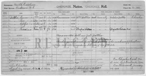 | Keywords: Enrollment for Cherokee Census Card R797 - NARA - 259860.tif Scope and content Name Adaline Battles Type Rejected Age 47 Sex Female Degree Indian Blood 1/8 City of Residence Andrews nc Name Adaline Battles Type Parent Sex Female Name Addie Battles Type Rejected Age 14 Sex Female Degree Indian Blood 1/16 City of Residence Andrews nc Name Laura Battles Type Rejected Age 20 Sex Female Degree Indian Blood 1/16 City of Residence Andrews nc Name Lax Battles Type Rejected Age 12 Sex Male Degree Indian Blood 1/16 City of Residence Andrews nc Name William Battles Type Parent Sex Male Name Zeb Battles Type Rejected Age 10 Sex Male Degree Indian Blood 1/16 City of Residence Andrews nc General notes 259860 Local identifier 75-53A-CHEROKEE R797 Department of the Interior Office of Indian Affairs Office of the Commissioner to the Five Civilized Tribes 1893 - 1914 NARA's Southwest Region Fort Worth NRFA 1400 John Burgess Drive Fort Worth TX 76140 Record group Record Group 75 Records of the Bureau of Indian Affairs 1793 - 1999 Record group ARC 404 Enrollment Cards compiled 1898 - 1914 Series ARC 251747 File unit File unit ARC Variant control numbers NAIL Control Number NRFF-75-53A-1198<br /> NAIL Control Number NRFF-75-53A-1199<br /> NAIL Control Number NRFF-75-53A-1200<br /> NAIL Control Number NRFF-75-53A-1201<br /> NAIL Control Number NRFF-75-53A-1202<br /> NAIL Control Number NRFF-75-53A-1204<br /> NAIL Control Number NRFF-75-53A-1207<br /> NAIL Control Number NRFF-75-53A-CHEROKEE R797 yes Other versions <gallery> File Enrollment_for_Cherokee_Census_Card_R797_-_NARA_-_259860 tif tif File Enrollment_for_Cherokee_Census_Card_R797_-_NARA_-_259860 jpg jpg </gallery> NARA-cooperation PD-USGov Cherokee census cards NARA TIF images with categorized JPGs |