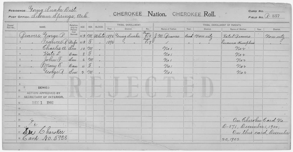 | Keywords: Enrollment for Cherokee Census Card R837 - NARA - 259900.tif Scope and content Name Charles A Beavers Type Rejected Age 10 Sex Male Degree Indian Blood White City of Residence Siloam Springs Arejected Name Frances R Beavers Type Rejected Age 43 Sex Female Degree Indian Blood White City of Residence Siloam Springs Arejected Name George P Beavers Type Rejected Age 43 Sex Male Degree Indian Blood White City of Residence Siloam Springs Arejected Name George R Beavers Type Rejected Age 2 Sex Male Degree Indian Blood White City of Residence Siloam Springs Arejected Name J M Beavers Type Parent Sex Male Name John F Beavers Type Rejected Age 6 Sex Male Degree Indian Blood White City of Residence Siloam Springs Arejected Name Kate L Beavers Type Rejected Age 8 Sex Female Degree Indian Blood White City of Residence Siloam Springs Arejected Name Kate L Beavers Type Parent Sex Female Name Mary E Beavers Type Rejected Age 4 Sex Female Degree Indian Blood White City of Residence Siloam Springs Arejected Name Louanna Humphries Type Parent Sex Female General notes 259900 Local identifier 75-53A-CHEROKEE R837 Department of the Interior Office of Indian Affairs Office of the Commissioner to the Five Civilized Tribes 1893 - 1914 NARA's Southwest Region Fort Worth NRFA 1400 John Burgess Drive Fort Worth TX 76140 Record group Record Group 75 Records of the Bureau of Indian Affairs 1793 - 1999 Record group ARC 404 Enrollment Cards compiled 1898 - 1914 Series ARC 251747 File unit File unit ARC Variant control numbers NAIL Control Number NRFF-75-53A-1370<br /> NAIL Control Number NRFF-75-53A-1373<br /> NAIL Control Number NRFF-75-53A-1374<br /> NAIL Control Number NRFF-75-53A-1375<br /> NAIL Control Number NRFF-75-53A-1376<br /> NAIL Control Number NRFF-75-53A-1378<br /> NAIL Control Number NRFF-75-53A-1380<br /> NAIL Control Number NRFF-75-53A-1381<br /> NAIL Control Number NRFF-75-53A-1382<br /> NAIL Control Number NRFF-75-53A-9447<br /> NAIL Control Number NRFF-75-53A-CHEROKEE R837 yes Other versions <gallery> File Enrollment_for_Cherokee_Census_Card_R837_-_NARA_-_259900 tif tif File Enrollment_for_Cherokee_Census_Card_R837_-_NARA_-_259900 jpg jpg </gallery> NARA-cooperation PD-USGov Cherokee census cards NARA TIF images with categorized JPGs |