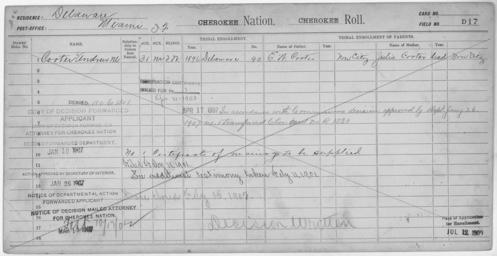 | Keywords: Enrollment for Cherokee Census Card D17 - NARA - 251765.tif Local identifier 75-53A-CHEROKEE D17 Department of the Interior Office of Indian Affairs Office of the Commissioner to the Five Civilized Tribes 1893 - 1914 NARA's Southwest Region Fort Worth NRFA 1400 John Burgess Drive Fort Worth TX 76140 Record group Record Group 75 Records of the Bureau of Indian Affairs 1793 - 1999 Record group ARC 404 Enrollment Cards compiled 1898 - 1914 Series ARC 251747 Variant control numbers NAIL Control Number NRFF-75-53A-4350<br /> NAIL Control Number NRFF-75-53A-4352<br /> NAIL Control Number NRFF-75-53A-4354<br /> NAIL Control Number NRFF-75-53A-CHEROKEE D17 General notes Scope and content Name Andrew W Cooter Type Doubtful Age 31 Sex Male Degree Indian Blood Intermarried White City of Residence Miami Name Ew Cooter Type Parent Sex Male Name Julia Cooter Type Parent Sex Female File unit File unit ARC yes <gallery> File Enrollment_for_Cherokee_Census_Card_D17_-_NARA_-_251765 tif tif File Enrollment_for_Cherokee_Census_Card_D17_-_NARA_-_251765 jpg jpg </gallery> NARA-cooperation PD-USGov Cherokee census cards NARA TIF images with categorized JPGs |