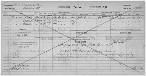 | Keywords: Enrollment for Cherokee Census Card D565 - NARA - 252313.jpg Scope and content Name Katie Brown Type Doubtful Age 14 Sex Female Degree Indian Blood FULL Roll Number Not Reported Post Office Dewey Name Lucinda Brown Type Doubtful Age 12 Sex Female Degree Indian Blood FULL Roll Number Not Reported Post Office Dewey Name Annie Brown Type Doubtful Age 10 Sex Female Degree Indian Blood FULL Roll Number Not Reported Post Office Dewey Name John Brown Type Parent Age Not Reported Sex Male Degree Indian Blood Not Reported Roll Number Not Reported Post Office Not Reported Name Sarah Brown Type Parent Age Not Reported Sex Female Degree Indian Blood Not Reported Roll Number Not Reported Post Office Not Reported General notes 252313 Local identifier 75-53A-CHEROKEE D565 Department of the Interior Office of Indian Affairs Office of the Commissioner to the Five Civilized Tribes 1893 - 1914 NARA's Southwest Region Fort Worth NRFA 1400 John Burgess Drive Fort Worth TX 76140 Record group Record Group 75 Records of the Bureau of Indian Affairs 1793 - 1999 Record group ARC 404 Enrollment Cards compiled 1898 - 1914 Series ARC 251747 File unit File unit ARC Variant control numbers NAIL Control Number NRFF-75-53A-54224<br /> NAIL Control Number NRFF-75-53A-54225<br /> NAIL Control Number NRFF-75-53A-54226<br /> NAIL Control Number NRFF-75-53A-54227<br /> NAIL Control Number NRFF-75-53A-54228<br /> NAIL Control Number NRFF-75-53A-CHEROKEE D565 Other versions <gallery> File Enrollment_for_Cherokee_Census_Card_D565_-_NARA_-_252313 tif tif File Enrollment_for_Cherokee_Census_Card_D565_-_NARA_-_252313 jpg jpg </gallery> NARA-cooperation PD-USGov Cherokee census cards |