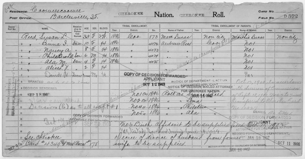 | Keywords: Enrollment for Cherokee Census Card D572 - NARA - 252320.jpg Scope and content Name Susan L Reed Type Doubtful Age 33 Sex Female Degree Indian Blood IW Roll Number Not Reported Post Office Bartlesville Name Lerina I Reed Type Doubtful Age 10 Sex Female Degree Indian Blood 1/4 Roll Number Not Reported Post Office Bartlesville Name Nancy A Reed Type Doubtful Age 8 Sex Female Degree Indian Blood 1/4 Roll Number Not Reported Post Office Bartlesville Name Philetus L A Reed Type Doubtful Age 6 Sex Male Degree Indian Blood 1/4 Roll Number Not Reported Post Office Bartlesville Name Ala M Reed Type Doubtful Age 4 Sex Female Degree Indian Blood 1/4 Roll Number Not Reported Post Office Bartlesville Name Alice L V Reed Type Doubtful Age 2 Sex Female Degree Indian Blood 1/4 Roll Number Not Reported Post Office Bartlesville Name David A Reed Type Doubtful Age 1 Sex Male Degree Indian Blood 1/4 Roll Number Not Reported Post Office Bartlesville Name Andrew Reed Type Parent Age Not Reported Sex Male Degree Indian Blood Not Reported Roll Number Not Reported Post Office Not Reported Name Matt Lucas Type Parent Age Not Reported Sex Male Degree Indian Blood Not Reported Roll Number Not Reported Post Office Not Reported Name Martha Lucas Type Parent Age Not Reported Sex Female Degree Indian Blood Not Reported Roll Number Not Reported Post Office Not Reported General notes 252320 Local identifier 75-53A-CHEROKEE D572 Department of the Interior Office of Indian Affairs Office of the Commissioner to the Five Civilized Tribes 1893 - 1914 NARA's Southwest Region Fort Worth NRFA 1400 John Burgess Drive Fort Worth TX 76140 Record group Record Group 75 Records of the Bureau of Indian Affairs 1793 - 1999 Record group ARC 404 Enrollment Cards compiled 1898 - 1914 Series ARC 251747 File unit File unit ARC Variant control numbers NAIL Control Number NRFF-75-53A-54252<br /> NAIL Control Number NRFF-75-53A-54253<br /> NAIL Control Number NRFF-75-53A-54254<br /> NAIL Control Number NRFF-75-53A-54255<br /> NAIL Control Number NRFF-75-53A-54256<br /> NAIL Control Number NRFF-75-53A-54257<br /> NAIL Control Number NRFF-75-53A-54258<br /> NAIL Control Number NRFF-75-53A-54259<br /> NAIL Control Number NRFF-75-53A-54260<br /> NAIL Control Number NRFF-75-53A-54261<br /> NAIL Control Number NRFF-75-53A-CHEROKEE D572 Other versions <gallery> File Enrollment_for_Cherokee_Census_Card_D572_-_NARA_-_252320 tif tif File Enrollment_for_Cherokee_Census_Card_D572_-_NARA_-_252320 jpg jpg </gallery> NARA-cooperation PD-USGov Cherokee census cards |