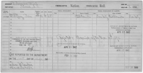 Keywords: Enrollment for Cherokee Census Card R180 - NARA - 259243.jpg Scope and content Name Bill Edmisten Type Parent Sex Male Name Mat Edmisten Type Parent Sex Female Name Ada McAffrey Type Rejected Age 20 Sex Female Degree Indian Blood Intermarried White City of Residence Klaus General notes 259243 Local identifier 75-53A-CHEROKEE R180 Department of the Interior Office of Indian Affairs Office of the Commissioner to the Five Civilized Tribes 1893 - 1914 NARA's Southwest Region Fort Worth NRFA 1400 John Burgess Drive Fort Worth TX 76140 Record group Record Group 75 Records of the Bureau of Indian Affairs 1793 - 1999 Record group ARC 404 Enrollment Cards compiled 1898 - 1914 Series ARC 251747 File unit File unit ARC Variant control numbers NAIL Control Number NRFF-75-53A-12459<br /> NAIL Control Number NRFF-75-53A-5914<br /> NAIL Control Number NRFF-75-53A-5915<br /> NAIL Control Number NRFF-75-53A-CHEROKEE R180 Other versions <gallery> File Enrollment_for_Cherokee_Census_Card_R180_-_NARA_-_259243 tif tif File Enrollment_for_Cherokee_Census_Card_R180_-_NARA_-_259243 jpg jpg </gallery> NARA-cooperation PD-USGov Cherokee census cards |