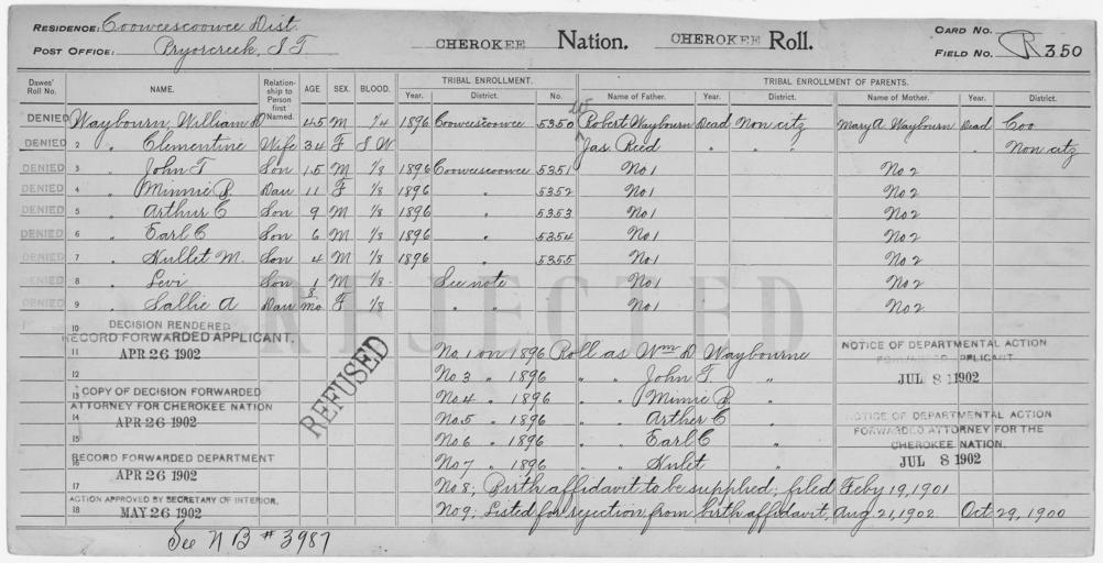 | Keywords: Enrollment for Cherokee Census Card R350 - NARA - 259413.jpg Scope and content Name James Reed Type Parent Sex Male Name Arthur C Waybourn Type Rejected Age 9 Sex Male Degree Indian Blood 1/8 City of Residence Pryorcreek Name Clementine Waybourn Type Rejected Age 34 Sex Female Degree Indian Blood Intermarried White City of Residence Pryorcreek Name Earl C Waybourn Type Rejected Age 9 Sex Male Degree Indian Blood 1/8 City of Residence Pryorcreek Name Hullet M Waybourn Type Rejected Age 4 Sex Male Degree Indian Blood 1/8 City of Residence Pryorcreek Name John T Waybourn Type Rejected Age 15 Sex Male Degree Indian Blood 1/8 City of Residence Pryorcreek Name Levi Waybourn Type Rejected Age 1 Sex Male Degree Indian Blood 1/8 City of Residence Pryorcreek Name Mary A Waybourn Type Parent Sex Female Name Minnie B Waybourn Type Rejected Age 11 Sex Female Degree Indian Blood 1/8 City of Residence Pryorcreek Name Robert Waybourn Type Parent Sex Male Name Sallie A Waybourn Type Rejected Age 1 Sex Female Degree Indian Blood 1/8 City of Residence Pryorcreek Name William D Waybourn Type Rejected Age 45 Sex Male Degree Indian Blood 1/4 City of Residence Pryorcreek General notes 259413 Local identifier 75-53A-CHEROKEE R350 Department of the Interior Office of Indian Affairs Office of the Commissioner to the Five Civilized Tribes 1893 - 1914 NARA's Southwest Region Fort Worth NRFA 1400 John Burgess Drive Fort Worth TX 76140 Record group Record Group 75 Records of the Bureau of Indian Affairs 1793 - 1999 Record group ARC 404 Enrollment Cards compiled 1898 - 1914 Series ARC 251747 File unit File unit ARC Variant control numbers NAIL Control Number NRFF-75-53A-15597<br /> NAIL Control Number NRFF-75-53A-20925<br /> NAIL Control Number NRFF-75-53A-20927<br /> NAIL Control Number NRFF-75-53A-20928<br /> NAIL Control Number NRFF-75-53A-20931<br /> NAIL Control Number NRFF-75-53A-20933<br /> NAIL Control Number NRFF-75-53A-20934<br /> NAIL Control Number NRFF-75-53A-20935<br /> NAIL Control Number NRFF-75-53A-20936<br /> NAIL Control Number NRFF-75-53A-20937<br /> NAIL Control Number NRFF-75-53A-20939<br /> NAIL Control Number NRFF-75-53A-20941<br /> NAIL Control Number NRFF-75-53A-CHEROKEE R350 Other versions <gallery> File Enrollment_for_Cherokee_Census_Card_R350_-_NARA_-_259413 tif tif File Enrollment_for_Cherokee_Census_Card_R350_-_NARA_-_259413 jpg jpg </gallery> NARA-cooperation PD-USGov Cherokee census cards |