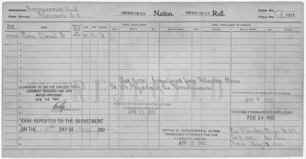 | Keywords: Enrollment for Cherokee Census Card R601 - NARA - 259664.jpg Scope and content Name Daniel C Moore Type Rejected Age 39 Sex Male Degree Indian Blood 1/8 City of Residence Claremore General notes 259664 Local identifier 75-53A-CHEROKEE R601 Department of the Interior Office of Indian Affairs Office of the Commissioner to the Five Civilized Tribes 1893 - 1914 NARA's Southwest Region Fort Worth NRFA 1400 John Burgess Drive Fort Worth TX 76140 Record group Record Group 75 Records of the Bureau of Indian Affairs 1793 - 1999 Record group ARC 404 Enrollment Cards compiled 1898 - 1914 Series ARC 251747 File unit File unit ARC Variant control numbers NAIL Control Number NRFF-75-53A-13337<br /> NAIL Control Number NRFF-75-53A-CHEROKEE R601 Other versions <gallery> File Enrollment_for_Cherokee_Census_Card_R601_-_NARA_-_259664 tif tif File Enrollment_for_Cherokee_Census_Card_R601_-_NARA_-_259664 jpg jpg </gallery> NARA-cooperation PD-USGov Cherokee census cards |