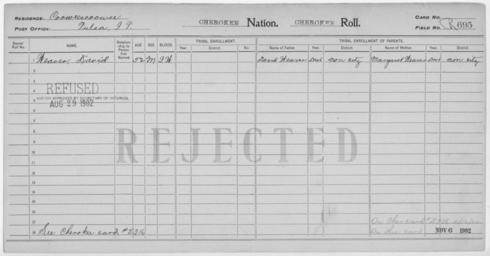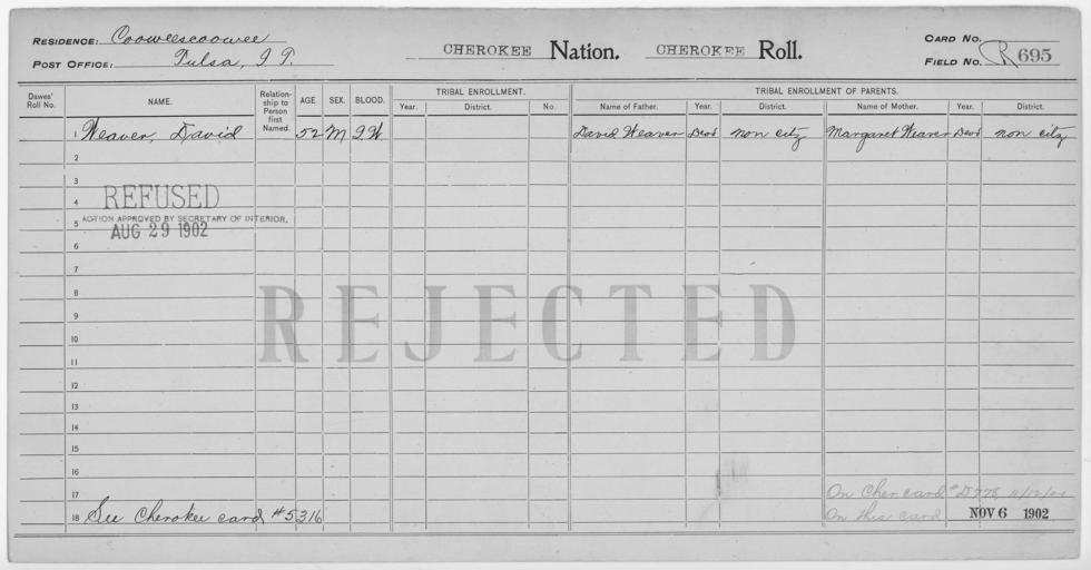 | Keywords: Enrollment for Cherokee Census Card R695 - NARA - 259758.jpg Scope and content Name David Weaver Type Rejected Age 52 Sex Male Degree Indian Blood Intermarried White City of Residence Tulsa Name David Weaver Type Parent Sex Male Name Margaret Weaver Type Parent Sex Female General notes 259758 Local identifier 75-53A-CHEROKEE R695 Department of the Interior Office of Indian Affairs Office of the Commissioner to the Five Civilized Tribes 1893 - 1914 NARA's Southwest Region Fort Worth NRFA 1400 John Burgess Drive Fort Worth TX 76140 Record group Record Group 75 Records of the Bureau of Indian Affairs 1793 - 1999 Record group ARC 404 Enrollment Cards compiled 1898 - 1914 Series ARC 251747 File unit File unit ARC Variant control numbers NAIL Control Number NRFF-75-53A-20958<br /> NAIL Control Number NRFF-75-53A-20959<br /> NAIL Control Number NRFF-75-53A-20984<br /> NAIL Control Number NRFF-75-53A-CHEROKEE R695 Other versions <gallery> File Enrollment_for_Cherokee_Census_Card_R695_-_NARA_-_259758 tif tif File Enrollment_for_Cherokee_Census_Card_R695_-_NARA_-_259758 jpg jpg </gallery> NARA-cooperation PD-USGov Cherokee census cards |