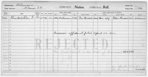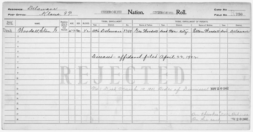 Keywords: Enrollment for Cherokee Census Card R750 - NARA - 259813.jpg Scope and content Name Ellen Woodall Type Parent Sex Female Name George Woodall Type Parent Sex Male Name Stan G Woodall Type Rejected Age 47 Sex Male Degree Indian Blood 1/2 City of Residence Klaus General notes 259813 Local identifier 75-53A-CHEROKEE R750 Department of the Interior Office of Indian Affairs Office of the Commissioner to the Five Civilized Tribes 1893 - 1914 NARA's Southwest Region Fort Worth NRFA 1400 John Burgess Drive Fort Worth TX 76140 Record group Record Group 75 Records of the Bureau of Indian Affairs 1793 - 1999 Record group ARC 404 Enrollment Cards compiled 1898 - 1914 Series ARC 251747 File unit File unit ARC Variant control numbers NAIL Control Number NRFF-75-53A-22313<br /> NAIL Control Number NRFF-75-53A-22316<br /> NAIL Control Number NRFF-75-53A-22331<br /> NAIL Control Number NRFF-75-53A-CHEROKEE R750 Other versions <gallery> File Enrollment_for_Cherokee_Census_Card_R750_-_NARA_-_259813 tif tif File Enrollment_for_Cherokee_Census_Card_R750_-_NARA_-_259813 jpg jpg </gallery> NARA-cooperation PD-USGov Cherokee census cards |