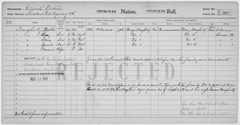 | Keywords: Enrollment for Cherokee Census Card R997 - NARA - 260060.jpg Scope and content Name Annie Daugherty Type Rejected Age 4 Sex Female Degree Indian Blood 3/4 City of Residence Sac Fox ok Name Fannie Daugherty Type Rejected Sex Female Degree Indian Blood Intermarried White City of Residence Sac Fox ok Name George Daugherty Type Parent Sex Male Name Harry Daugherty Type Rejected Age 9 Sex Male Degree Indian Blood 3/4 City of Residence Sac Fox ok Name Martin Daugherty Type Rejected Age 26 Sex Male Degree Indian Blood AS City of Residence Sac Fox ok Name Mary Daugherty Type Parent Sex Female Name Sam Daugherty Type Rejected Age 7 Sex Male Degree Indian Blood 3/4 City of Residence Sac Fox ok General notes 260060 Local identifier 75-53A-CHEROKEE R997 Department of the Interior Office of Indian Affairs Office of the Commissioner to the Five Civilized Tribes 1893 - 1914 NARA's Southwest Region Fort Worth NRFA 1400 John Burgess Drive Fort Worth TX 76140 Record group Record Group 75 Records of the Bureau of Indian Affairs 1793 - 1999 Record group ARC 404 Enrollment Cards compiled 1898 - 1914 Series ARC 251747 File unit File unit ARC Variant control numbers NAIL Control Number NRFF-75-53A-4964<br /> NAIL Control Number NRFF-75-53A-4974<br /> NAIL Control Number NRFF-75-53A-4975<br /> NAIL Control Number NRFF-75-53A-4976<br /> NAIL Control Number NRFF-75-53A-4987<br /> NAIL Control Number NRFF-75-53A-4989<br /> NAIL Control Number NRFF-75-53A-4995<br /> NAIL Control Number NRFF-75-53A-CHEROKEE R997 Other versions <gallery> File Enrollment_for_Cherokee_Census_Card_R997_-_NARA_-_260060 tif tif File Enrollment_for_Cherokee_Census_Card_R997_-_NARA_-_260060 jpg jpg </gallery> NARA-cooperation PD-USGov Cherokee census cards |