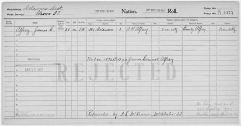 Keywords: Enrollment for Cherokee Census Card R1075 - NARA - 260138.jpg Scope and content Name A H Alfrey Type Parent Sex Male Name Emily Alfrey Type Parent Sex Female Name James S Alfrey Type Rejected Age 38 Sex Male Degree Indian Blood Intermarried White City of Residence Grove General notes 260138 Local identifier 75-53A-CHEROKEE R1075 Department of the Interior Office of Indian Affairs Office of the Commissioner to the Five Civilized Tribes 1893 - 1914 NARA's Southwest Region Fort Worth NRFA 1400 John Burgess Drive Fort Worth TX 76140 Record group Record Group 75 Records of the Bureau of Indian Affairs 1793 - 1999 Record group ARC 404 Enrollment Cards compiled 1898 - 1914 Series ARC 251747 File unit File unit ARC Variant control numbers NAIL Control Number NRFF-75-53A-363<br /> NAIL Control Number NRFF-75-53A-364<br /> NAIL Control Number NRFF-75-53A-367<br /> NAIL Control Number NRFF-75-53A-CHEROKEE R1075 Other versions <gallery> File Enrollment_for_Cherokee_Census_Card_R1075_-_NARA_-_260138 tif tif File Enrollment_for_Cherokee_Census_Card_R1075_-_NARA_-_260138 jpg jpg </gallery> NARA-cooperation PD-USGov Cherokee census cards |