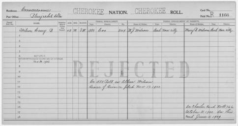 | Keywords: Enrollment for Cherokee Census Card R1166 - NARA - 260229.jpg Scope and content Name Henry B Wilson Type Rejected Age 43 Sex Male Degree Indian Blood Intermarried White City of Residence Bluejacket ok Name M J Wilson Type Parent Sex Male Name Mary B Wilson Type Parent Sex Female General notes 260229 Local identifier 75-53A-CHEROKEE R1166 Department of the Interior Office of Indian Affairs Office of the Commissioner to the Five Civilized Tribes 1893 - 1914 NARA's Southwest Region Fort Worth NRFA 1400 John Burgess Drive Fort Worth TX 76140 Record group Record Group 75 Records of the Bureau of Indian Affairs 1793 - 1999 Record group ARC 404 Enrollment Cards compiled 1898 - 1914 Series ARC 251747 File unit File unit ARC Variant control numbers NAIL Control Number NRFF-75-53A-21904<br /> NAIL Control Number NRFF-75-53A-21974<br /> NAIL Control Number NRFF-75-53A-21990<br /> NAIL Control Number NRFF-75-53A-CHEROKEE R1166 Other versions <gallery> File Enrollment_for_Cherokee_Census_Card_R1166_-_NARA_-_260229 tif tif File Enrollment_for_Cherokee_Census_Card_R1166_-_NARA_-_260229 jpg jpg </gallery> NARA-cooperation PD-USGov Cherokee census cards |