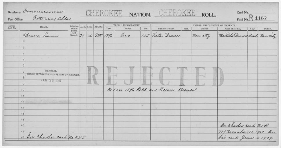 | Keywords: Enrollment for Cherokee Census Card R1167 - NARA - 260230.jpg Scope and content Name Louis Bruere Type Rejected Age 37 Sex Male Degree Indian Blood Intermarried White City of Residence Catoosa ok Name Matilda Bruere Type Parent Sex Female Name Victor Bruere Type Parent Sex Male General notes 260230 Local identifier 75-53A-CHEROKEE R1167 Department of the Interior Office of Indian Affairs Office of the Commissioner to the Five Civilized Tribes 1893 - 1914 NARA's Southwest Region Fort Worth NRFA 1400 John Burgess Drive Fort Worth TX 76140 Record group Record Group 75 Records of the Bureau of Indian Affairs 1793 - 1999 Record group ARC 404 Enrollment Cards compiled 1898 - 1914 Series ARC 251747 File unit File unit ARC Variant control numbers NAIL Control Number NRFF-75-53A-2639<br /> NAIL Control Number NRFF-75-53A-2640<br /> NAIL Control Number NRFF-75-53A-2641<br /> NAIL Control Number NRFF-75-53A-CHEROKEE R1167 Other versions <gallery> File Enrollment_for_Cherokee_Census_Card_R1167_-_NARA_-_260230 tif tif File Enrollment_for_Cherokee_Census_Card_R1167_-_NARA_-_260230 jpg jpg </gallery> NARA-cooperation PD-USGov Cherokee census cards |