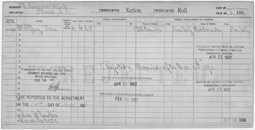 Keywords: Enrollment for Cherokee Census Card R180 - NARA - 259243.tif Scope and content Name Bill Edmisten Type Parent Sex Male Name Mat Edmisten Type Parent Sex Female Name Ada McAffrey Type Rejected Age 20 Sex Female Degree Indian Blood Intermarried White City of Residence Klaus General notes 259243 Local identifier 75-53A-CHEROKEE R180 Department of the Interior Office of Indian Affairs Office of the Commissioner to the Five Civilized Tribes 1893 - 1914 NARA's Southwest Region Fort Worth NRFA 1400 John Burgess Drive Fort Worth TX 76140 Record group Record Group 75 Records of the Bureau of Indian Affairs 1793 - 1999 Record group ARC 404 Enrollment Cards compiled 1898 - 1914 Series ARC 251747 File unit File unit ARC Variant control numbers NAIL Control Number NRFF-75-53A-12459<br /> NAIL Control Number NRFF-75-53A-5914<br /> NAIL Control Number NRFF-75-53A-5915<br /> NAIL Control Number NRFF-75-53A-CHEROKEE R180 yes Other versions <gallery> File Enrollment_for_Cherokee_Census_Card_R180_-_NARA_-_259243 tif tif File Enrollment_for_Cherokee_Census_Card_R180_-_NARA_-_259243 jpg jpg </gallery> NARA-cooperation PD-USGov Cherokee census cards NARA TIF images with categorized JPGs |