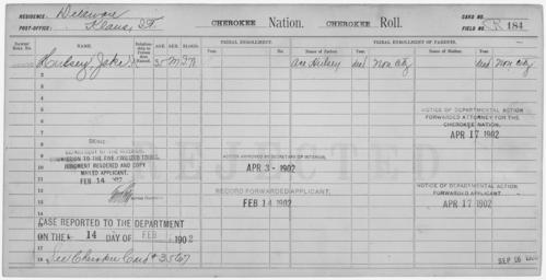 Keywords: Enrollment for Cherokee Census Card R184 - NARA - 259247.tif Scope and content Name Ace Hulsey Type Parent Sex Male Name Jake H Hulsey Type Rejected Age 35 Sex Male Degree Indian Blood Intermarried White City of Residence Klaus General notes 259247 Local identifier 75-53A-CHEROKEE R184 Department of the Interior Office of Indian Affairs Office of the Commissioner to the Five Civilized Tribes 1893 - 1914 NARA's Southwest Region Fort Worth NRFA 1400 John Burgess Drive Fort Worth TX 76140 Record group Record Group 75 Records of the Bureau of Indian Affairs 1793 - 1999 Record group ARC 404 Enrollment Cards compiled 1898 - 1914 Series ARC 251747 File unit File unit ARC Variant control numbers NAIL Control Number NRFF-75-53A-9400<br /> NAIL Control Number NRFF-75-53A-9405<br /> NAIL Control Number NRFF-75-53A-CHEROKEE R184 yes Other versions <gallery> File Enrollment_for_Cherokee_Census_Card_R184_-_NARA_-_259247 tif tif File Enrollment_for_Cherokee_Census_Card_R184_-_NARA_-_259247 jpg jpg </gallery> NARA-cooperation PD-USGov Cherokee census cards NARA TIF images with categorized JPGs |