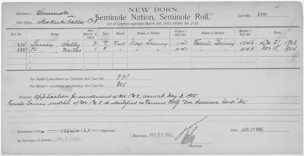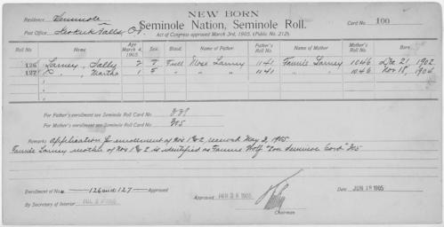 Keywords: Enrollment for Seminole Census Card 100 - NARA - 267674.tif Scope and content Name Cookogee Type Parent Sex Male City of Residence tp Name Linda Harjo Type By Blood Age 35 Sex Female Degree Indian Blood Full Roll Number 350 City of Residence yh Name Woxie Harjo Type By Blood Age 33 Sex Male Degree Indian Blood Full Roll Number 349 City of Residence th Name Tusekia Type Parent Sex Male Roll Number 350 City of Residence yh Name Sally Larney Type Newborn Age 2 Sex Female Degree Indian Blood FULL Roll Number 126 Post Office Keokuk Falls Name Martha Larney Type Newborn Age 1 Sex Female Degree Indian Blood FULL Roll Number 127 Post Office Keokuk Falls General notes 267674 Local identifier 75-53A-SEMINOLE 100 Department of the Interior Office of Indian Affairs Office of the Commissioner to the Five Civilized Tribes 1893 - 1914 NARA's Southwest Region Fort Worth NRFA 1400 John Burgess Drive Fort Worth TX 76140 Record group Record Group 75 Records of the Bureau of Indian Affairs 1793 - 1999 Record group ARC 404 Enrollment Cards compiled 1898 - 1914 Series ARC 251747 File unit File unit ARC Variant control numbers NAIL Control Number NRFF-75-53A-28787<br /> NAIL Control Number NRFF-75-53A-34602<br /> NAIL Control Number NRFF-75-53A-35309<br /> NAIL Control Number NRFF-75-53A-50196<br /> NAIL Control Number NRFF-75-53A-52668<br /> NAIL Control Number NRFF-75-53A-52669<br /> NAIL Control Number NRFF-75-53A-SEMINOLE 100 yes Other versions <gallery> File Enrollment_for_Seminole_Census_Card_100_-_NARA_-_267674 tif tif File Enrollment_for_Seminole_Census_Card_100_-_NARA_-_267674 jpg jpg </gallery> NARA-cooperation PD-USGov Cherokee census cards NARA TIF images with categorized JPGs |