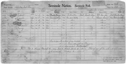 Keywords: Enrollment for Seminole Census Card 334 - NARA - 267908.jpg Scope and content Name Coserchilly Type Parent Sex Male City of Residence Creek Name Lizzie Deer Type By Blood Age 26 Sex Female Degree Indian Blood 1/2 Roll Number 1128 City of Residence ee Name Nancy Deer Type By Blood Age 1 Sex Female Degree Indian Blood 1/2 Roll Number 1131 City of Residence ee Name Robert Deer Type By Blood Age 24 Sex Male Degree Indian Blood 1/2 Roll Number 1127 City of Residence oh Name Stella Deer Type By Blood Age 5 Sex Female Degree Indian Blood 1/2 City of Residence ee Name Thomas Deer Type By Blood Age 6 Sex Male Degree Indian Blood 1/2 Roll Number 1129 City of Residence ee Name Thompson Deer Type By Blood Age 4 Sex Male Degree Indian Blood 1/2 Roll Number 1130 City of Residence ee Name Echoille Type Parent Sex Male City of Residence Creek Name Oklossee Type Parent Sex Female City of Residence oh General notes 267908 Local identifier 75-53A-SEMINOLE 334 Department of the Interior Office of Indian Affairs Office of the Commissioner to the Five Civilized Tribes 1893 - 1914 NARA's Southwest Region Fort Worth NRFA 1400 John Burgess Drive Fort Worth TX 76140 Record group Record Group 75 Records of the Bureau of Indian Affairs 1793 - 1999 Record group ARC 404 Enrollment Cards compiled 1898 - 1914 Series ARC 251747 File unit File unit ARC Variant control numbers NAIL Control Number NRFF-75-53A-28943<br /> NAIL Control Number NRFF-75-53A-30120<br /> NAIL Control Number NRFF-75-53A-30147<br /> NAIL Control Number NRFF-75-53A-30153<br /> NAIL Control Number NRFF-75-53A-30163<br /> NAIL Control Number NRFF-75-53A-30166<br /> NAIL Control Number NRFF-75-53A-30167<br /> NAIL Control Number NRFF-75-53A-30763<br /> NAIL Control Number NRFF-75-53A-43393<br /> NAIL Control Number NRFF-75-53A-SEMINOLE 334 Other versions <gallery> File Enrollment_for_Seminole_Census_Card_334_-_NARA_-_267908 tif tif File Enrollment_for_Seminole_Census_Card_334_-_NARA_-_267908 jpg jpg </gallery> NARA-cooperation PD-USGov Seminole census cards |