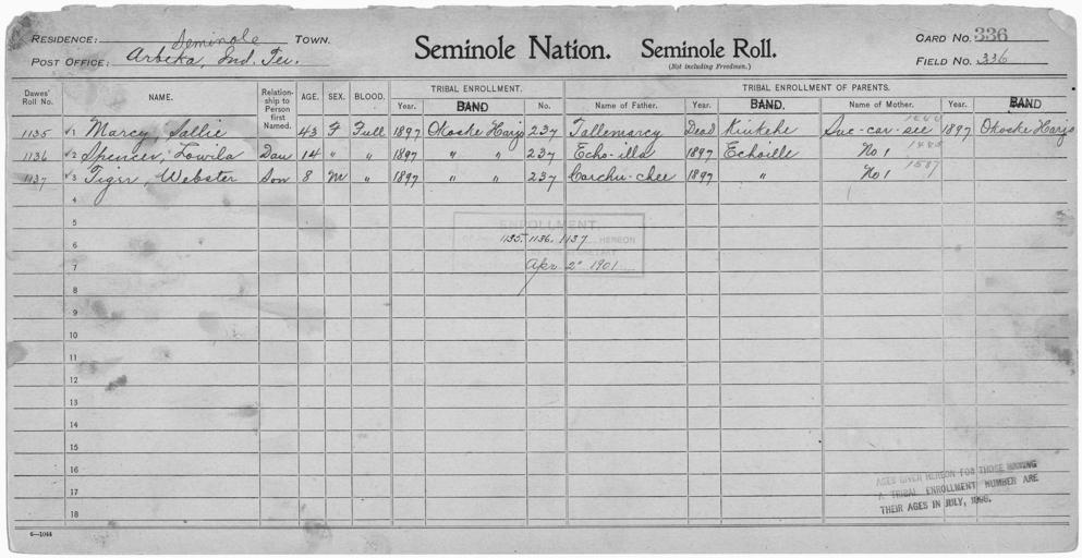 Keywords: Enrollment for Seminole Census Card 336 - NARA - 267910.jpg Scope and content Name Carchuchee Type Parent Sex Male City of Residence e Name Echoilla Type Parent Sex Male City of Residence e Name Sallie Marcy Type By Blood Age 43 Sex Female Degree Indian Blood Full Roll Number 1135 City of Residence oh Name Lowila Spencer Type By Blood Age 14 Sex Female Degree Indian Blood Full Roll Number 1136 City of Residence oh Name Succarsee Type Parent Sex Female City of Residence oh Name Tallemarcy Type Parent Sex Male City of Residence k Name Webster Tiger Type By Blood Age 8 Sex Male Degree Indian Blood Full Roll Number 1137 City of Residence oh General notes 267910 Local identifier 75-53A-SEMINOLE 336 Department of the Interior Office of Indian Affairs Office of the Commissioner to the Five Civilized Tribes 1893 - 1914 NARA's Southwest Region Fort Worth NRFA 1400 John Burgess Drive Fort Worth TX 76140 Record group Record Group 75 Records of the Bureau of Indian Affairs 1793 - 1999 Record group ARC 404 Enrollment Cards compiled 1898 - 1914 Series ARC 251747 File unit File unit ARC Variant control numbers NAIL Control Number NRFF-75-53A-27122<br /> NAIL Control Number NRFF-75-53A-30761<br /> NAIL Control Number NRFF-75-53A-40483<br /> NAIL Control Number NRFF-75-53A-47738<br /> NAIL Control Number NRFF-75-53A-48166<br /> NAIL Control Number NRFF-75-53A-48527<br /> NAIL Control Number NRFF-75-53A-49841<br /> NAIL Control Number NRFF-75-53A-SEMINOLE 336 Other versions <gallery> File Enrollment_for_Seminole_Census_Card_336_-_NARA_-_267910 tif tif File Enrollment_for_Seminole_Census_Card_336_-_NARA_-_267910 jpg jpg </gallery> NARA-cooperation PD-USGov Seminole census cards |