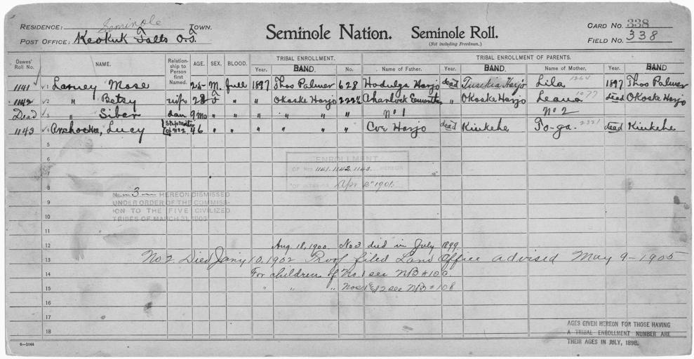 Keywords: Enrollment for Seminole Census Card 338 - NARA - 267912.jpg Scope and content Name Lucy Archockee Type By Blood Age 46 Sex Female Degree Indian Blood Full Roll Number 1143 City of Residence oh Name Aharlock Emarther Type Parent Sex Male City of Residence oh Name Coe Harjo Type Parent Sex Male City of Residence k Name Hodulga Harjo Type Parent Sex Male City of Residence th Name Betsy Larney Type By Blood Age 28 Sex Female Degree Indian Blood Full Roll Number 1142 City of Residence oh Name Mose Larney Type By Blood Age 25 Sex Male Degree Indian Blood Full Roll Number 1141 City of Residence tp Name Siber Larney Type By Blood Age 1 Sex Female Degree Indian Blood Full City of Residence oh Name Leana Type Parent Sex Female City of Residence oh Name Lila Type Parent Sex Female City of Residence tp Name Toga Type Parent Sex Female City of Residence k General notes 267912 Local identifier 75-53A-SEMINOLE 338 Department of the Interior Office of Indian Affairs Office of the Commissioner to the Five Civilized Tribes 1893 - 1914 NARA's Southwest Region Fort Worth NRFA 1400 John Burgess Drive Fort Worth TX 76140 Record group Record Group 75 Records of the Bureau of Indian Affairs 1793 - 1999 Record group ARC 404 Enrollment Cards compiled 1898 - 1914 Series ARC 251747 File unit File unit ARC Variant control numbers NAIL Control Number NRFF-75-53A-23343<br /> NAIL Control Number NRFF-75-53A-30872<br /> NAIL Control Number NRFF-75-53A-34223<br /> NAIL Control Number NRFF-75-53A-34409<br /> NAIL Control Number NRFF-75-53A-38981<br /> NAIL Control Number NRFF-75-53A-39047<br /> NAIL Control Number NRFF-75-53A-39061<br /> NAIL Control Number NRFF-75-53A-39216<br /> NAIL Control Number NRFF-75-53A-39477<br /> NAIL Control Number NRFF-75-53A-49985<br /> NAIL Control Number NRFF-75-53A-SEMINOLE 338 Other versions <gallery> File Enrollment_for_Seminole_Census_Card_338_-_NARA_-_267912 tif tif File Enrollment_for_Seminole_Census_Card_338_-_NARA_-_267912 jpg jpg </gallery> NARA-cooperation PD-USGov Seminole census cards |