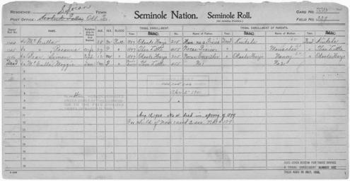 Keywords: Enrollment for Seminole Census Card 339 - NARA - 267913.tif Scope and content Name Simon Bear Type By Blood Age 12 Sex Male Degree Indian Blood Full Roll Number 1146 City of Residence oh Name Nocas Emarther Type Parent Sex Male City of Residence oh Name Henneo Fixico Type Parent Sex Male City of Residence k Name Nocas Fixico Type Parent Sex Male City of Residence k Name McCulla Type By Blood Age 28 Sex Male Degree Indian Blood Full Roll Number 1144 City of Residence oh Name Maggie McCulla Type By Blood Age 1 Sex Female Degree Indian Blood Full City of Residence tl Name Rosanna McCulla Type By Blood Age 27 Sex Female Degree Indian Blood Full Roll Number 1145 City of Residence tl Name Monacher Type Parent Sex Female City of Residence tl General notes 267913 Local identifier 75-53A-SEMINOLE 339 Department of the Interior Office of Indian Affairs Office of the Commissioner to the Five Civilized Tribes 1893 - 1914 NARA's Southwest Region Fort Worth NRFA 1400 John Burgess Drive Fort Worth TX 76140 Record group Record Group 75 Records of the Bureau of Indian Affairs 1793 - 1999 Record group ARC 404 Enrollment Cards compiled 1898 - 1914 Series ARC 251747 File unit File unit ARC Variant control numbers NAIL Control Number NRFF-75-53A-24317<br /> NAIL Control Number NRFF-75-53A-30876<br /> NAIL Control Number NRFF-75-53A-31907<br /> NAIL Control Number NRFF-75-53A-31997<br /> NAIL Control Number NRFF-75-53A-41005<br /> NAIL Control Number NRFF-75-53A-41008<br /> NAIL Control Number NRFF-75-53A-41011<br /> NAIL Control Number NRFF-75-53A-42399<br /> NAIL Control Number NRFF-75-53A-SEMINOLE 339 yes Other versions <gallery> File Enrollment_for_Seminole_Census_Card_339_-_NARA_-_267913 tif tif File Enrollment_for_Seminole_Census_Card_339_-_NARA_-_267913 jpg jpg </gallery> NARA-cooperation PD-USGov Seminole census cards NARA TIF images with categorized JPGs |