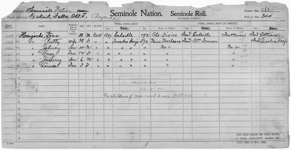| Keywords: Enrollment for Seminole Census Card 344 - NARA - 267918.tif Scope and content Name Chofixico Type Parent Sex Male City of Residence e Name Foas Harjoche Type By Blood Age 38 Sex Male Degree Indian Blood Full Roll Number 1158 City of Residence e Name Iney Harjoche Type By Blood Age 12 Sex Female Degree Indian Blood Full Roll Number 1161 City of Residence th Name Jimmy Harjoche Type By Blood Age 6 Sex Male Degree Indian Blood Full Roll Number 1162 City of Residence th Name Johney Harjoche Type By Blood Age 14 Sex Male Degree Indian Blood Full Roll Number 1160 City of Residence th Name Louisa Harjoche Type By Blood Age 3 Sex Female Degree Indian Blood Full Roll Number 1163 City of Residence th Name Putty Harjoche Type By Blood Age 28 Sex Female Degree Indian Blood Full Roll Number 1159 City of Residence th Name Micco Mochassa Type Parent Sex Male City of Residence wc General notes 267918 Local identifier 75-53A-SEMINOLE 344 Department of the Interior Office of Indian Affairs Office of the Commissioner to the Five Civilized Tribes 1893 - 1914 NARA's Southwest Region Fort Worth NRFA 1400 John Burgess Drive Fort Worth TX 76140 Record group Record Group 75 Records of the Bureau of Indian Affairs 1793 - 1999 Record group ARC 404 Enrollment Cards compiled 1898 - 1914 Series ARC 251747 File unit File unit ARC Variant control numbers NAIL Control Number NRFF-75-53A-27965<br /> NAIL Control Number NRFF-75-53A-35363<br /> NAIL Control Number NRFF-75-53A-35372<br /> NAIL Control Number NRFF-75-53A-35373<br /> NAIL Control Number NRFF-75-53A-35374<br /> NAIL Control Number NRFF-75-53A-35383<br /> NAIL Control Number NRFF-75-53A-35398<br /> NAIL Control Number NRFF-75-53A-42360<br /> NAIL Control Number NRFF-75-53A-SEMINOLE 344 yes Other versions <gallery> File Enrollment_for_Seminole_Census_Card_344_-_NARA_-_267918 tif tif File Enrollment_for_Seminole_Census_Card_344_-_NARA_-_267918 jpg jpg </gallery> NARA-cooperation PD-USGov Seminole census cards NARA TIF images with categorized JPGs |