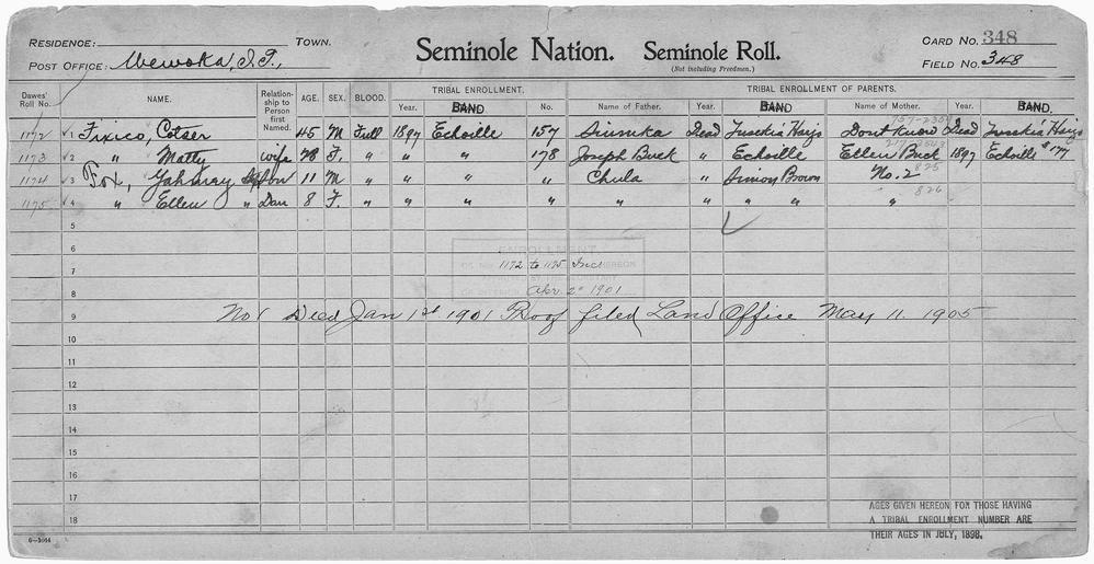 Keywords: Enrollment for Seminole Census Card 348 - NARA - 267922.tif Scope and content Name Ellen Buck Type Parent Sex Female City of Residence e Name Joseph Buck Type Parent Sex Male City of Residence e Name Chula Type Parent Sex Male City of Residence sb Name Cotser Ficxico Type By Blood Age 45 Sex Male Degree Indian Blood Full Roll Number 1172 City of Residence e Name Matty Fixico Type By Blood Age 28 Sex Female Degree Indian Blood Full Roll Number 1173 City of Residence e Name Ellen Fox Type By Blood Age 8 Sex Female Degree Indian Blood Full Roll Number 1175 City of Residence e Name Yahmey Fox Type By Blood Age 11 Sex Male Degree Indian Blood Full Roll Number 1174 City of Residence e Name Siunika Type Parent Sex Male City of Residence th General notes 267922 Local identifier 75-53A-SEMINOLE 348 Department of the Interior Office of Indian Affairs Office of the Commissioner to the Five Civilized Tribes 1893 - 1914 NARA's Southwest Region Fort Worth NRFA 1400 John Burgess Drive Fort Worth TX 76140 Record group Record Group 75 Records of the Bureau of Indian Affairs 1793 - 1999 Record group ARC 404 Enrollment Cards compiled 1898 - 1914 Series ARC 251747 File unit File unit ARC Variant control numbers NAIL Control Number NRFF-75-53A-26484<br /> NAIL Control Number NRFF-75-53A-26498<br /> NAIL Control Number NRFF-75-53A-28035<br /> NAIL Control Number NRFF-75-53A-31370<br /> NAIL Control Number NRFF-75-53A-31983<br /> NAIL Control Number NRFF-75-53A-32417<br /> NAIL Control Number NRFF-75-53A-32463<br /> NAIL Control Number NRFF-75-53A-47120<br /> NAIL Control Number NRFF-75-53A-SEMINOLE 348 yes Other versions <gallery> File Enrollment_for_Seminole_Census_Card_348_-_NARA_-_267922 tif tif File Enrollment_for_Seminole_Census_Card_348_-_NARA_-_267922 jpg jpg </gallery> NARA-cooperation PD-USGov Seminole census cards NARA TIF images with categorized JPGs |