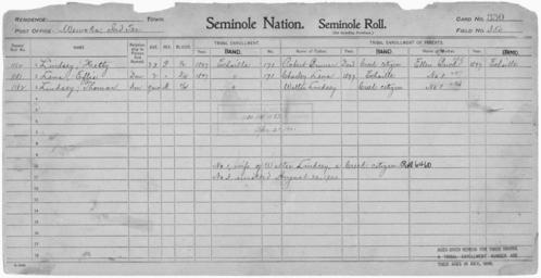 Keywords: Enrollment for Seminole Census Card 350 - NARA - 267924.jpg Scope and content Name Robert Bruner Type Parent Sex Male City of Residence Creek Name Ellen Buck Type Parent Sex Female City of Residence e Name Charley Lena Type Parent Sex Male City of Residence e Name Effie Lena Type By Blood Age 2 Sex Female Degree Indian Blood 3/4 Roll Number 1181 City of Residence e Name Hetty Lindsey Type By Blood Age 23 Sex Female Degree Indian Blood 1/2 Roll Number 1180 City of Residence e Name Thomas Lindsey Type By Blood Age 1 Sex Male Degree Indian Blood 1/4 Roll Number 1182 City of Residence e Name Walter Lindsey Type Parent Sex Male City of Residence Creek General notes 267924 Local identifier 75-53A-SEMINOLE 350 Department of the Interior Office of Indian Affairs Office of the Commissioner to the Five Civilized Tribes 1893 - 1914 NARA's Southwest Region Fort Worth NRFA 1400 John Burgess Drive Fort Worth TX 76140 Record group Record Group 75 Records of the Bureau of Indian Affairs 1793 - 1999 Record group ARC 404 Enrollment Cards compiled 1898 - 1914 Series ARC 251747 File unit File unit ARC Variant control numbers NAIL Control Number NRFF-75-53A-26389<br /> NAIL Control Number NRFF-75-53A-26486<br /> NAIL Control Number NRFF-75-53A-39280<br /> NAIL Control Number NRFF-75-53A-39282<br /> NAIL Control Number NRFF-75-53A-39536<br /> NAIL Control Number NRFF-75-53A-39553<br /> NAIL Control Number NRFF-75-53A-39558<br /> NAIL Control Number NRFF-75-53A-SEMINOLE 350 Other versions <gallery> File Enrollment_for_Seminole_Census_Card_350_-_NARA_-_267924 tif tif File Enrollment_for_Seminole_Census_Card_350_-_NARA_-_267924 jpg jpg </gallery> NARA-cooperation PD-USGov Seminole census cards |