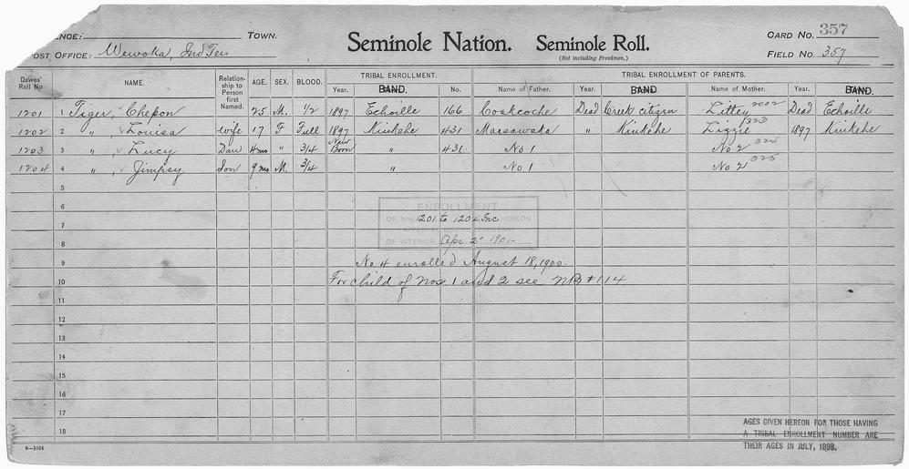 Keywords: Enrollment for Seminole Census Card 357 - NARA - 267931.tif Scope and content Name Coakcoche Type Parent Sex Male City of Residence Creek Name Littey Type Parent Sex Female City of Residence e Name Marsawaka Type Parent Sex Male City of Residence k Name Chepon Tiger Type By Blood Age 25 Sex Male Degree Indian Blood 1/2 Roll Number 1201 City of Residence e Name Jimpsey Tiger Type By Blood Age 1 Sex Male Degree Indian Blood 3/4 Roll Number 1204 City of Residence k Name Louisa Tiger Type By Blood Age 17 Sex Female Degree Indian Blood Full Roll Number 1202 City of Residence k Name Lucy Tiger Type By Blood Age 1 Sex Female Degree Indian Blood 3/4 Roll Number 1203 City of Residence k General notes 267931 Local identifier 75-53A-SEMINOLE 357 Department of the Interior Office of Indian Affairs Office of the Commissioner to the Five Civilized Tribes 1893 - 1914 NARA's Southwest Region Fort Worth NRFA 1400 John Burgess Drive Fort Worth TX 76140 Record group Record Group 75 Records of the Bureau of Indian Affairs 1793 - 1999 Record group ARC 404 Enrollment Cards compiled 1898 - 1914 Series ARC 251747 File unit File unit ARC Variant control numbers NAIL Control Number NRFF-75-53A-28361<br /> NAIL Control Number NRFF-75-53A-39598<br /> NAIL Control Number NRFF-75-53A-40545<br /> NAIL Control Number NRFF-75-53A-49397<br /> NAIL Control Number NRFF-75-53A-49533<br /> NAIL Control Number NRFF-75-53A-49639<br /> NAIL Control Number NRFF-75-53A-49654<br /> NAIL Control Number NRFF-75-53A-SEMINOLE 357 yes Other versions <gallery> File Enrollment_for_Seminole_Census_Card_357_-_NARA_-_267931 tif tif File Enrollment_for_Seminole_Census_Card_357_-_NARA_-_267931 jpg jpg </gallery> NARA-cooperation PD-USGov Seminole census cards NARA TIF images with categorized JPGs |
