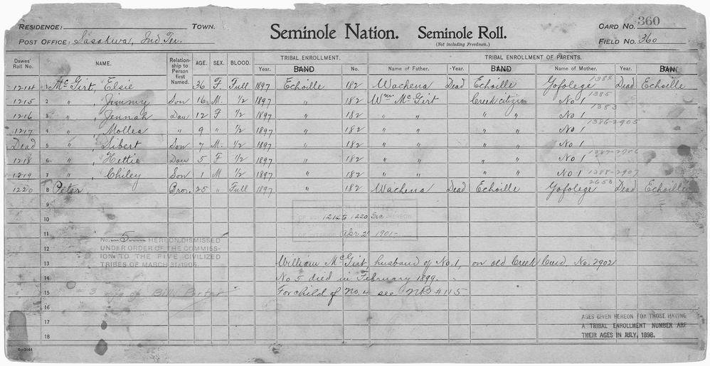 | Keywords: Enrollment for Seminole Census Card 360 - NARA - 267934.tif Scope and content Name Chiley McGirt Type By Blood Age 1 Sex Male Degree Indian Blood 1/2 Roll Number 1219 City of Residence e Name Elsie McGirt Type By Blood Age 36 Sex Female Degree Indian Blood Full Roll Number 1214 City of Residence e Name Hettie McGirt Type By Blood Age 5 Sex Female Degree Indian Blood 1/2 Roll Number 1218 City of Residence e Name Jennah McGirt Type By Blood Age 12 Sex Female Degree Indian Blood 1/2 Roll Number 1216 City of Residence e Name Jimmy McGirt Type By Blood Age 16 Sex Male Degree Indian Blood 1/2 Roll Number 1215 City of Residence e Name Mollea McGirt Type By Blood Age 9 Sex Female Degree Indian Blood 1/2 Roll Number 1217 City of Residence e Name Sibert McGirt Type By Blood Age 7 Sex Male Degree Indian Blood 1/2 City of Residence e Name William McGirt Type Parent Sex Male City of Residence Creek Name Peter Type By Blood Age 25 Sex Male Degree Indian Blood Full Roll Number 1220 City of Residence e Name Wachena Type Parent Sex Male City of Residence e Name Yofolege Type Parent Sex Female City of Residence e General notes 267934 Local identifier 75-53A-SEMINOLE 360 Department of the Interior Office of Indian Affairs Office of the Commissioner to the Five Civilized Tribes 1893 - 1914 NARA's Southwest Region Fort Worth NRFA 1400 John Burgess Drive Fort Worth TX 76140 Record group Record Group 75 Records of the Bureau of Indian Affairs 1793 - 1999 Record group ARC 404 Enrollment Cards compiled 1898 - 1914 Series ARC 251747 File unit File unit ARC Variant control numbers NAIL Control Number NRFF-75-53A-41160<br /> NAIL Control Number NRFF-75-53A-41169<br /> NAIL Control Number NRFF-75-53A-41176<br /> NAIL Control Number NRFF-75-53A-41179<br /> NAIL Control Number NRFF-75-53A-41184<br /> NAIL Control Number NRFF-75-53A-41194<br /> NAIL Control Number NRFF-75-53A-41197<br /> NAIL Control Number NRFF-75-53A-41203<br /> NAIL Control Number NRFF-75-53A-44011<br /> NAIL Control Number NRFF-75-53A-50362<br /> NAIL Control Number NRFF-75-53A-52575<br /> NAIL Control Number NRFF-75-53A-SEMINOLE 360 yes Other versions <gallery> File Enrollment_for_Seminole_Census_Card_360_-_NARA_-_267934 tif tif File Enrollment_for_Seminole_Census_Card_360_-_NARA_-_267934 jpg jpg </gallery> NARA-cooperation PD-USGov Seminole census cards NARA TIF images with categorized JPGs |