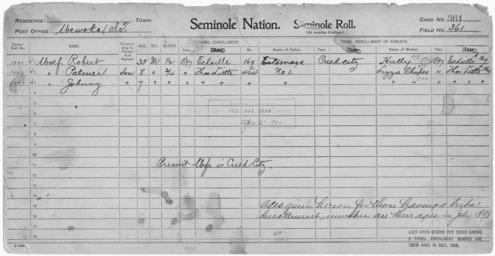 Keywords: Enrollment for Seminole Census Card 361 - NARA - 267935.tif Scope and content Name Lizzie Chupco Type Parent Sex Female City of Residence tl Name Estemaya Type Parent Sex Male City of Residence Creek Name Hully Type Parent Sex Female City of Residence e Name Johnny Wolf Type By Blood Age 7 Sex Male Degree Indian Blood 3/4 Roll Number 1223 City of Residence tl Name Palmer Wolf Type By Blood Age 8 Sex Male Degree Indian Blood 3/4 Roll Number 1222 City of Residence tl Name Robert Wolf Type By Blood Age 35 Sex Male Degree Indian Blood 1/2 Roll Number 1221 City of Residence e General notes 267935 Local identifier 75-53A-SEMINOLE 361 Department of the Interior Office of Indian Affairs Office of the Commissioner to the Five Civilized Tribes 1893 - 1914 NARA's Southwest Region Fort Worth NRFA 1400 John Burgess Drive Fort Worth TX 76140 Record group Record Group 75 Records of the Bureau of Indian Affairs 1793 - 1999 Record group ARC 404 Enrollment Cards compiled 1898 - 1914 Series ARC 251747 File unit File unit ARC Variant control numbers NAIL Control Number NRFF-75-53A-28102<br /> NAIL Control Number NRFF-75-53A-31079<br /> NAIL Control Number NRFF-75-53A-36900<br /> NAIL Control Number NRFF-75-53A-51855<br /> NAIL Control Number NRFF-75-53A-51883<br /> NAIL Control Number NRFF-75-53A-51886<br /> NAIL Control Number NRFF-75-53A-SEMINOLE 361 yes Other versions <gallery> File Enrollment_for_Seminole_Census_Card_361_-_NARA_-_267935 tif tif File Enrollment_for_Seminole_Census_Card_361_-_NARA_-_267935 jpg jpg </gallery> NARA-cooperation PD-USGov Seminole census cards NARA TIF images with categorized JPGs |